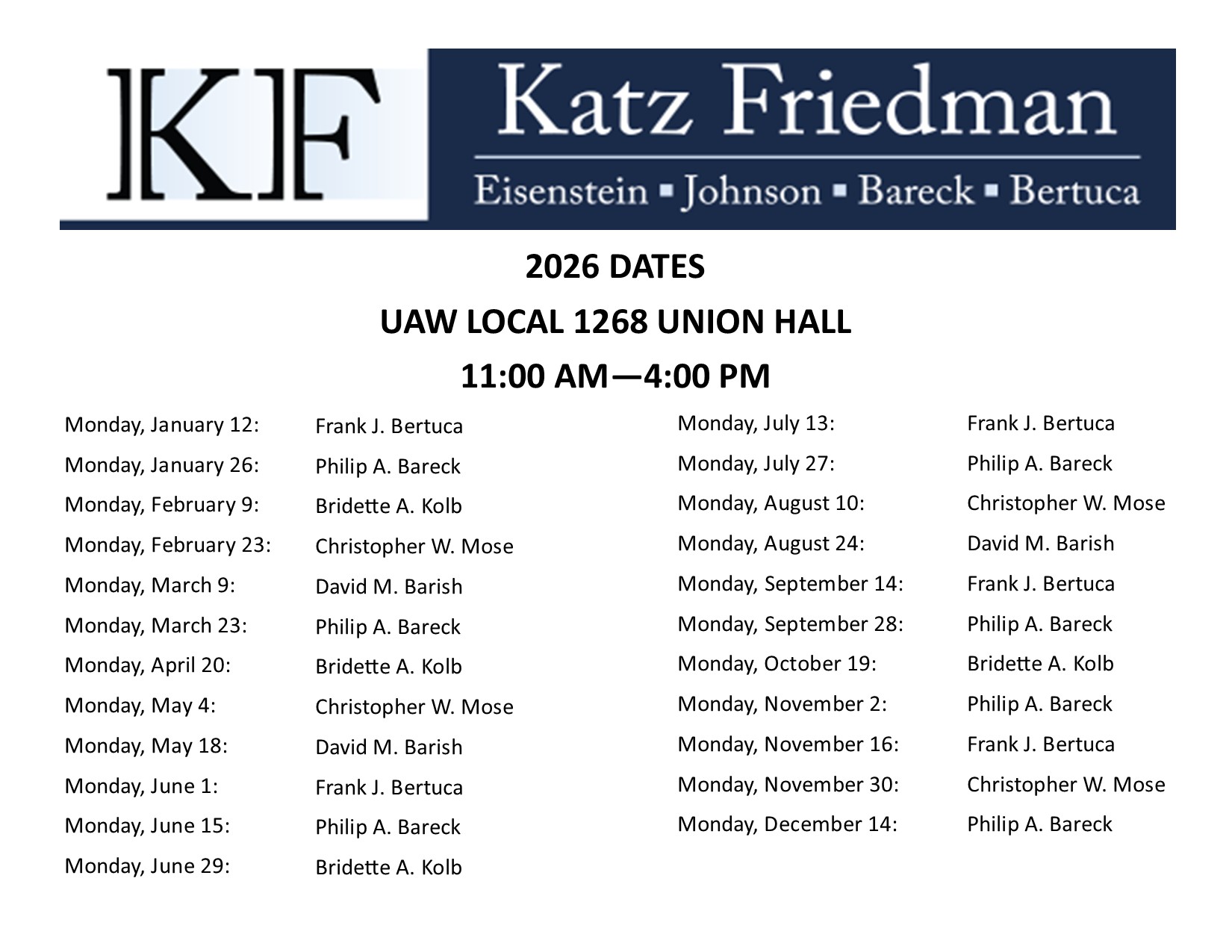 Blog Katz, Friedman, Eisenstein, Johnson, Bareck & Bertuca Attorneys Schedule mary.bingenheimer 04 Feb, 2026 Social share icons