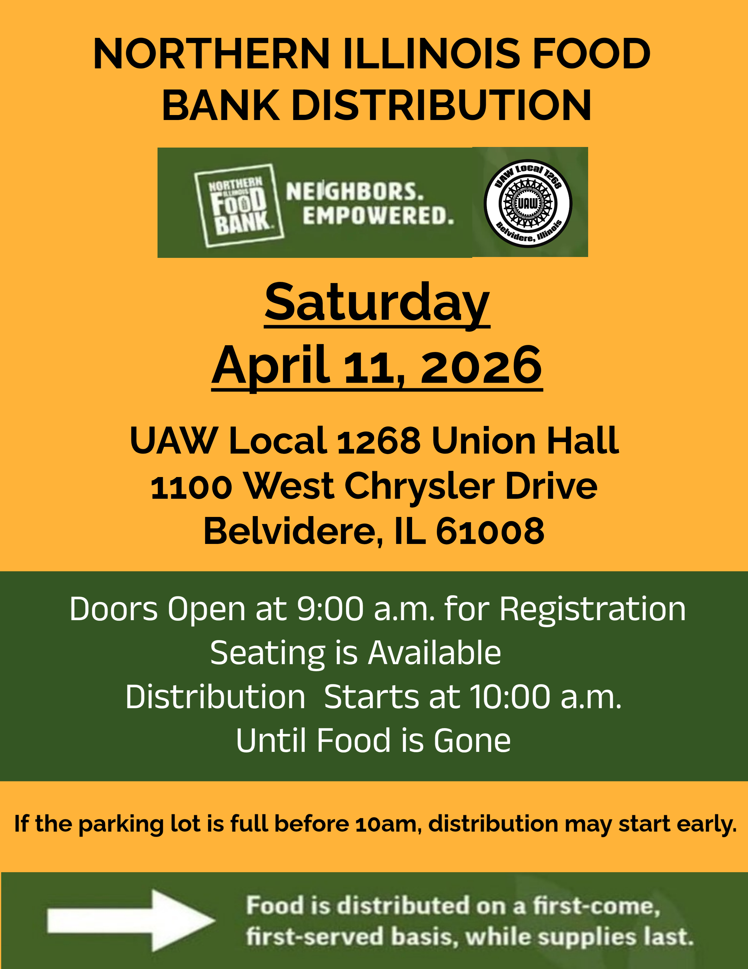 UAW LOCAL 1268 CALENDER NIFB Food Distribution April 11, 2026 9:00AM - 11:30AM Social share icons Volunteers, please show up at 9:00 am. Distribution begins at 10:00 am.